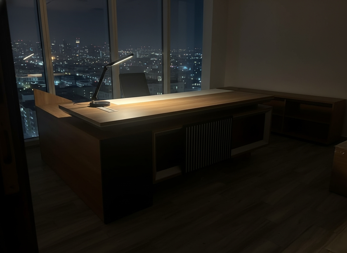 - اللمسة النهائية للخشب، سواء كانت مطفية (Matte) أو شبه لامعة (Semi-Gloss)، تضفي على المكتب هالة من الفخامة الهادئة.