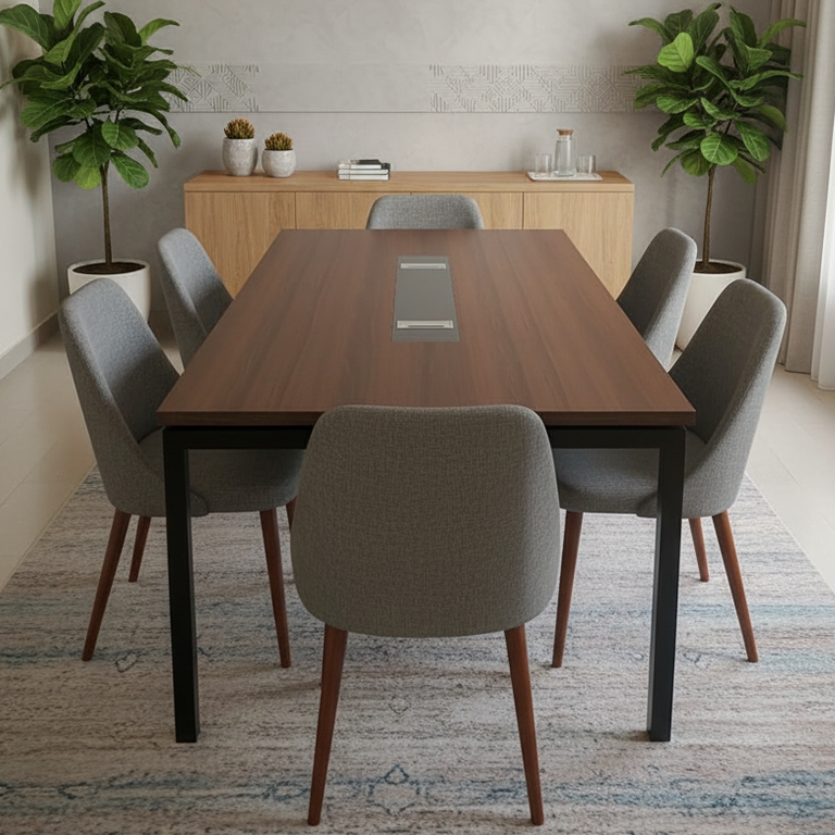 - صُممت هذه الطاولة لتكون مركزاً للتفاعل والتخطيط، حيث يمتزج المظهر الجمالي المودرن بـ الكفاءة الوظيفية العالية لخلق بيئة اجتماعات مثالية.