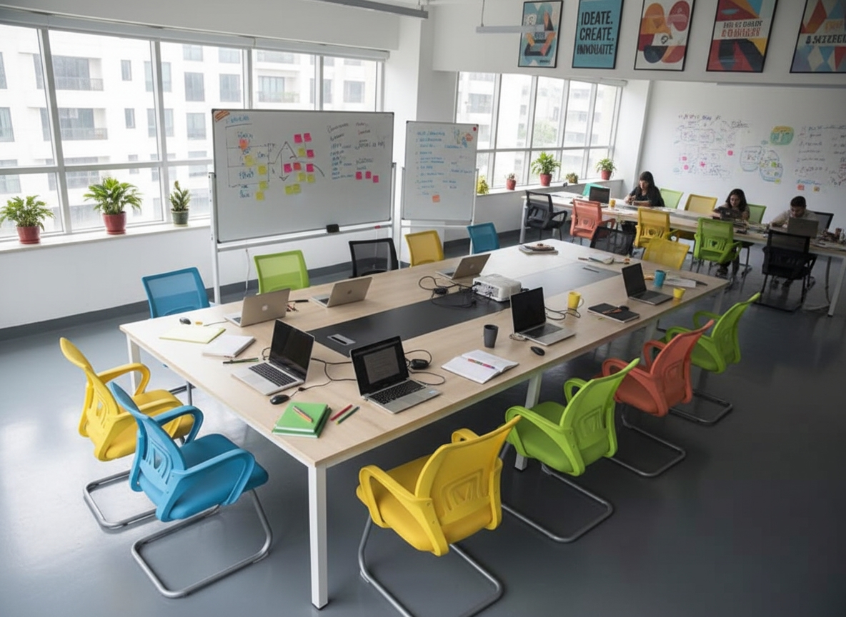 • مساحة رحبة للتعاون: يضمن تصميم الطاولة أنها توفر مساحة كافية وواسعة لكل المشاركين، مما يسهل توزيع الأوراق، فتح الحواسيب المحمولة، ويشجع على التواصل المفتوح والمريح بين أعضاء الفريق.
