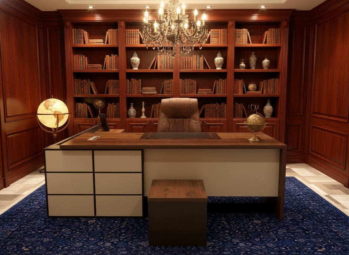 - اللمسة النهائية للخشب، سواء كانت مطفية (Matte) أو شبه لامعة (Semi-Gloss)، تضفي على المكتب هالة من الفخامة الهادئة.